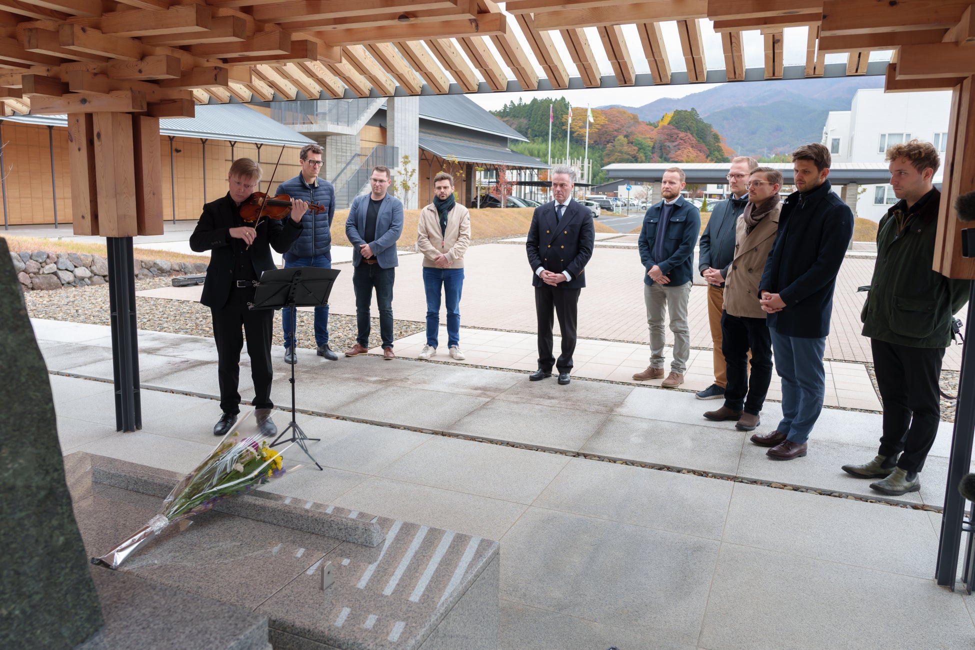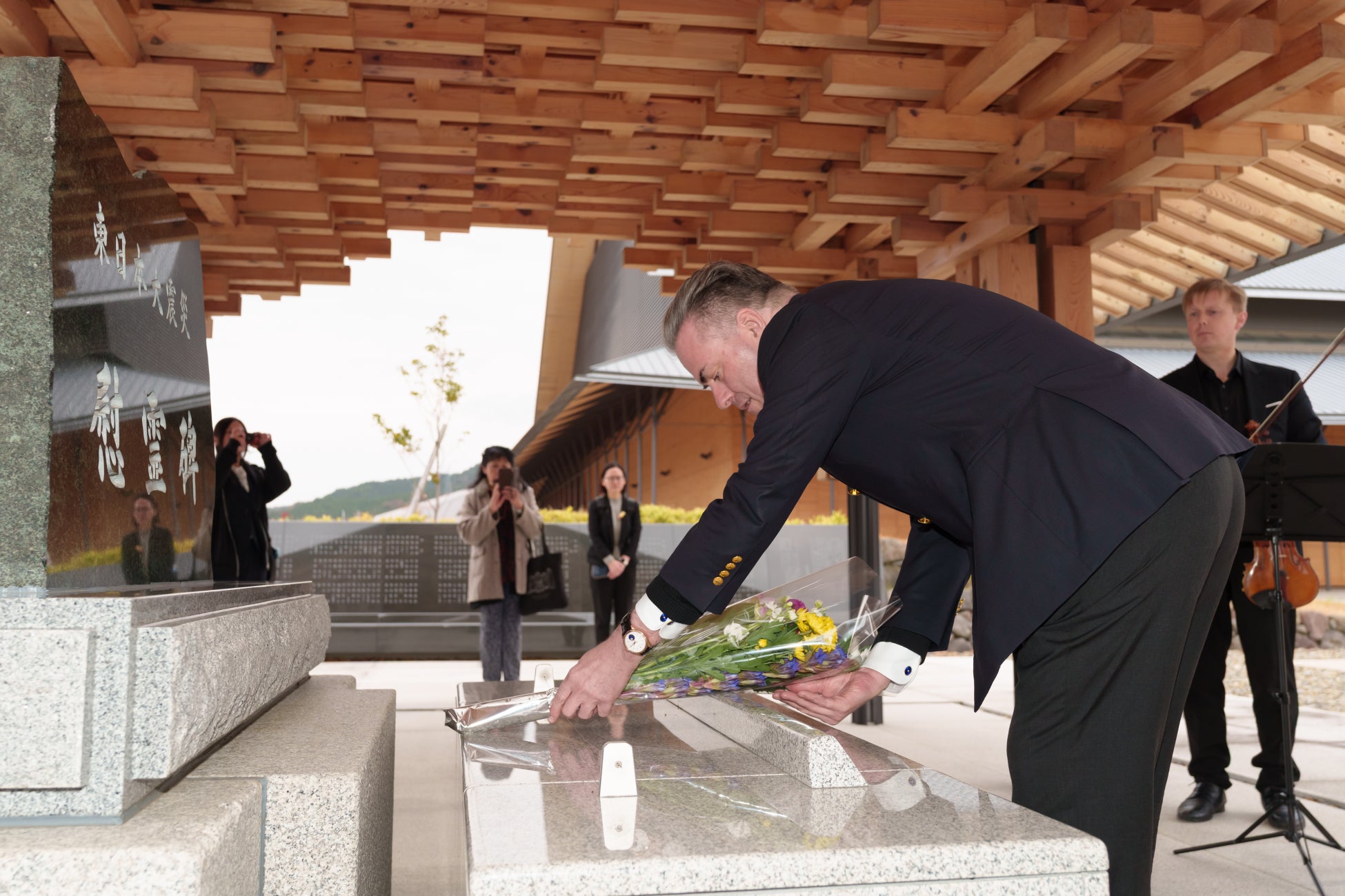 付近の高田松原津波復興祈念公園での献花、さらには陸前高田市 東日本大震災追悼施設・刻銘碑の前にて震災で犠牲となった人々のためにヴァイオリンのベンジャミン・モリソンがバッハ:無伴奏ヴァイオリン・ソナタ第3番よりラルゴを演奏しました。