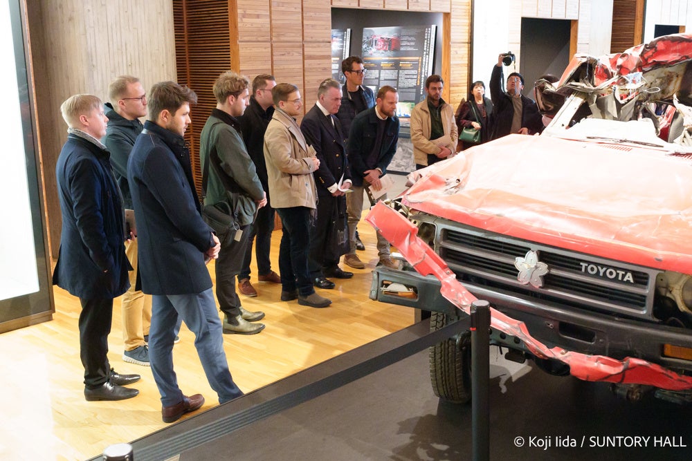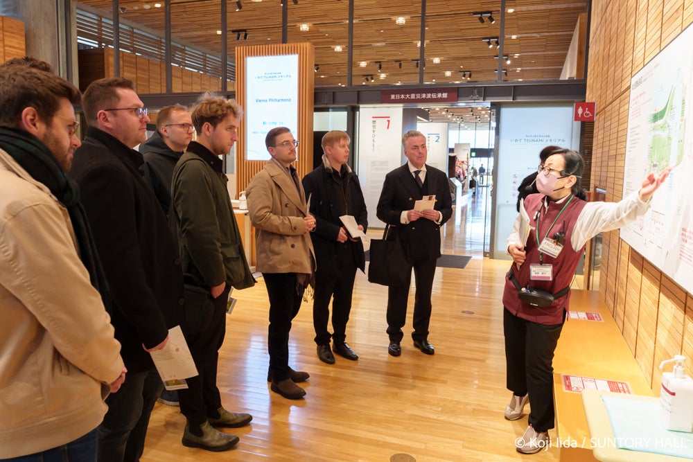 前日11月8日に姫路公演を終えたばかりのウィーン・フィルメンバーは、まず、東日本大震災津波伝承館を見学しました。津波の甚大な被害の記録を目の当たりにするとともに自然災害から命を守り、乗り越え、未来へとつなげていく知恵に触れた楽団員たち。ガイドの方の説明を聞くだけでなく、熱心に質問を投げかけていました。
