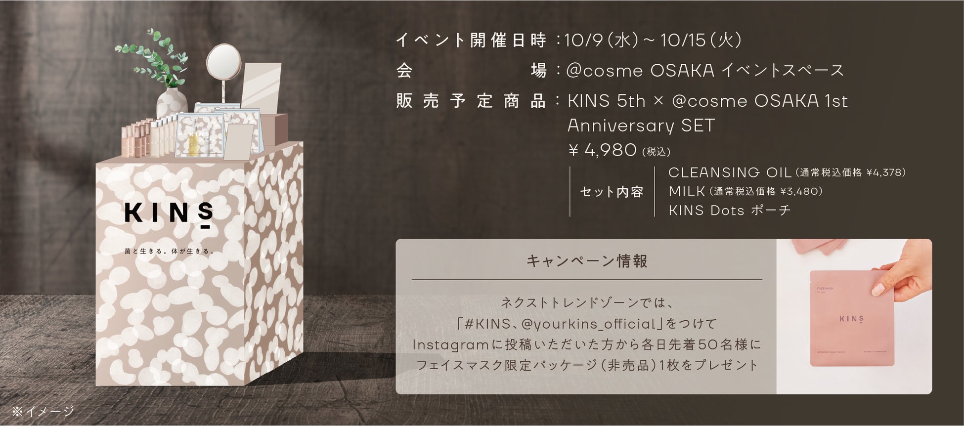 限定商品の「KINS 5th × @cosme OSAKA 1st Anniversary SET」を個数限定で販売予定です。また、ネクストトレンドゾーンでは、KINSのスキンケア製品をフルラインナップでお試しいただけます。この機会に是非@cosme OSAKAに足をお運びください。