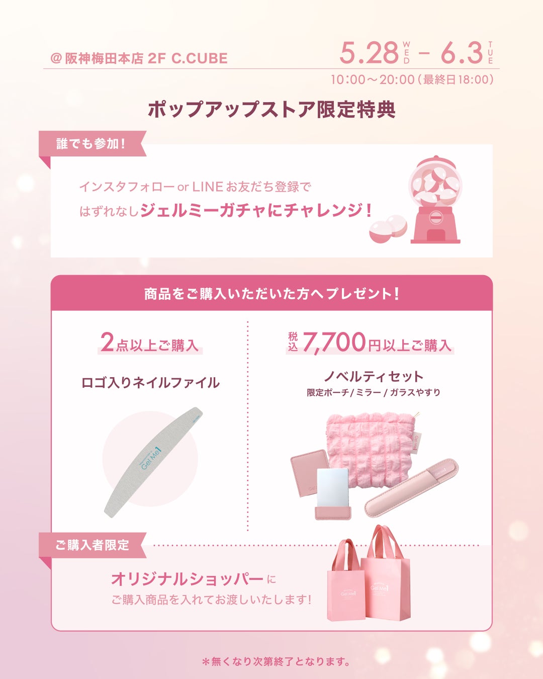 夏の限定色や10周年限定色、通常公式オンラインショップでしか購入できないオンライン限定色を含むお好きなカラーをお試しできるタッチアップスペースをご用意。さらに特別なキットやノベルティ、ジェルミーガチャなど、POP UPイベントならではの豪華特典が盛りだくさんです。