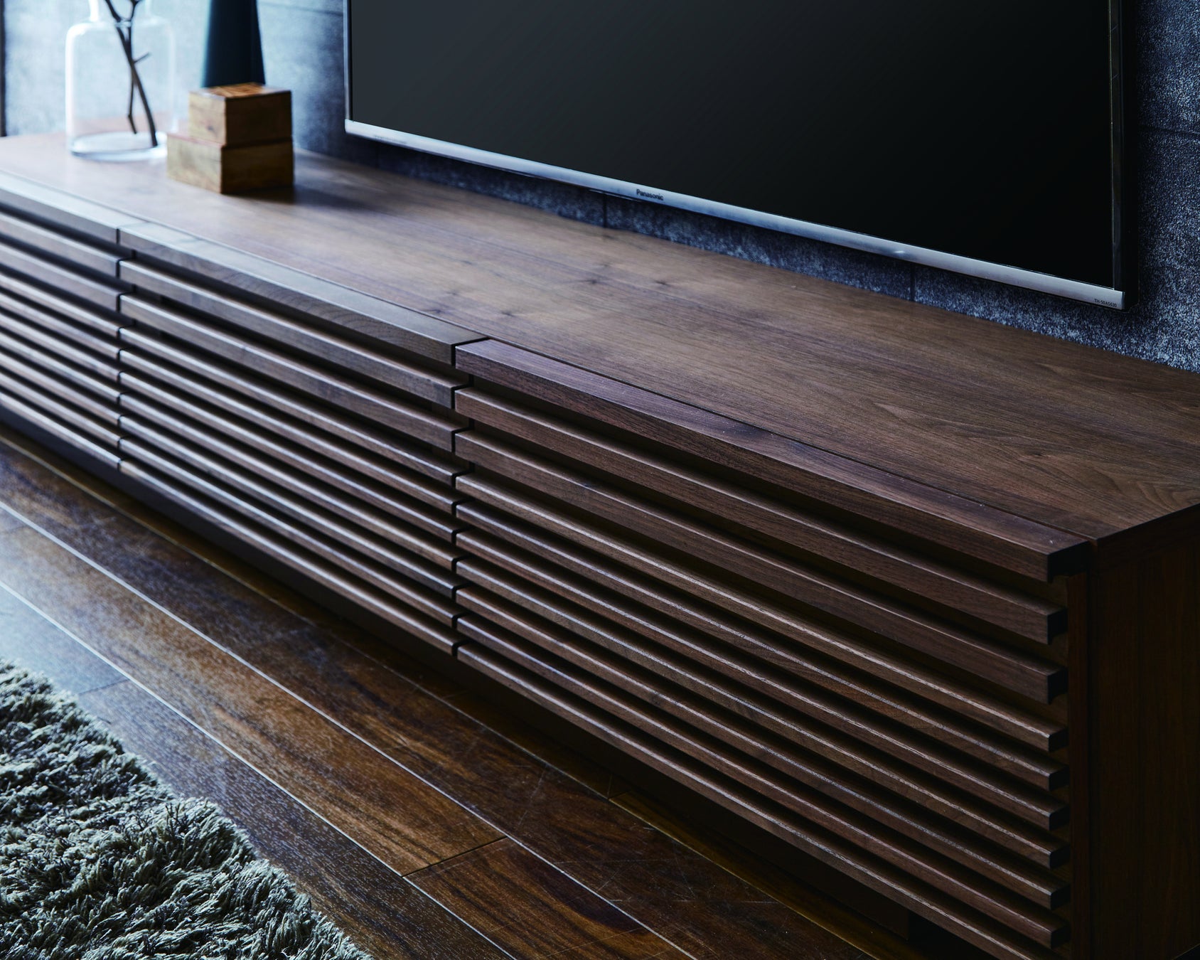 TVボードの印象を一番左右する前板には、無垢のルーバーをもちいています。ルーバーなどの横桟のデザインは、TVボードのデザインの中ではもっとも人気のスタイルです。