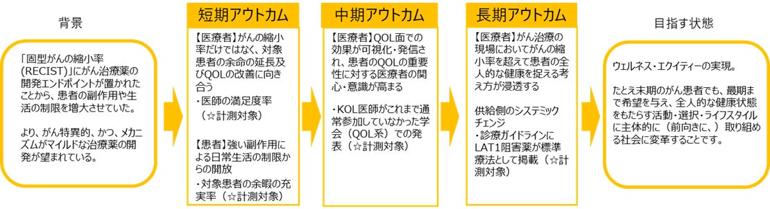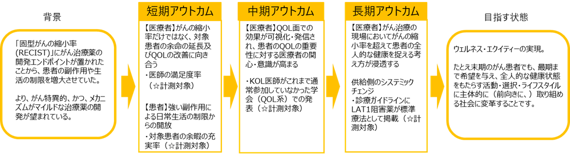 SIIFはこれまで蓄積してきた知見に基づき、SIIFICの取り組みを通して、ウェルネス領域のシステムチェンジを目指すインパクト投資・IMMを実践し、その実例や知見を公開・発信、人材を育成・輩出することを目指しています。そのために今回の出資検討では、システム思考の手法であるループ図(図1)やロジックモデル(図2)を用いて、患者・患者の家族・医療従事者・製薬企業・行政との対話を重ね、深く課題の構造分析を実施しました。その結果、当ファンドのインパクト・ゴールであるウェルネス・エクイティーの実現に、創業者の遠藤先生の理念「たとえ末期のがん患者でも、最期まで希望を与え続けられる医療体制を構築しなくてはならない」が整合すると判断しました。がんの縮小率という従来の医療パラダイムにおける成果指標だけでなく、患者のQOLや全人的な健康・ウェルネスの追求をインパクト指標に定め、医療関係者へのウェルネスパラダイムの波及を目指しています。今回のジェイファーマへの出資を通して、ウェルネス領域のシステムチェンジが起きるよう支援してまいります。