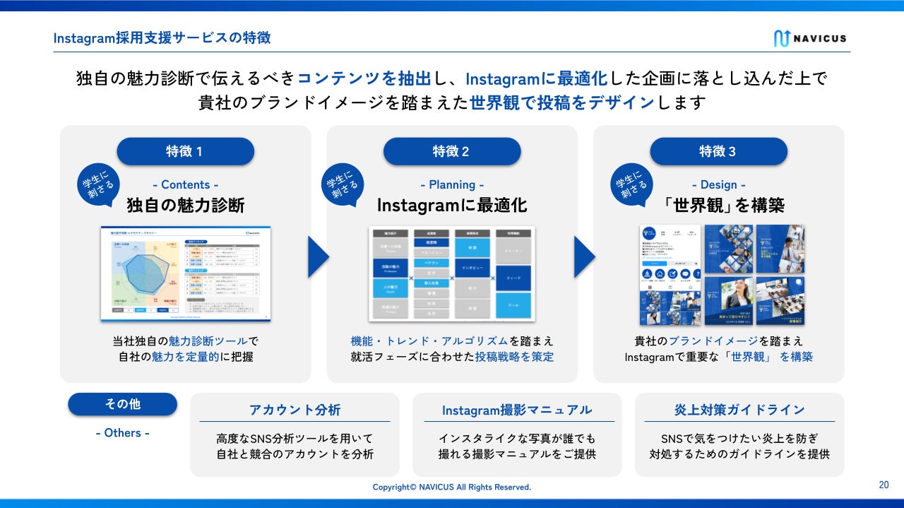SNSを通じて企業様や地方自治体様のコミュニケーション支援サービスを提供する株式会社NAVICUS(本社:東京都千代田区、代表取締役:武内 一矢、以下:NAVICUS)は、このたび会社の採用活動に特化した「Instagram採用支援サービス」のご提供を開始いたしました。本サービスでは、独自の診断を用いた会社の魅力抽出から、採用を目的としたInstagram運用の実行・分析までを一貫してサポートいたします。