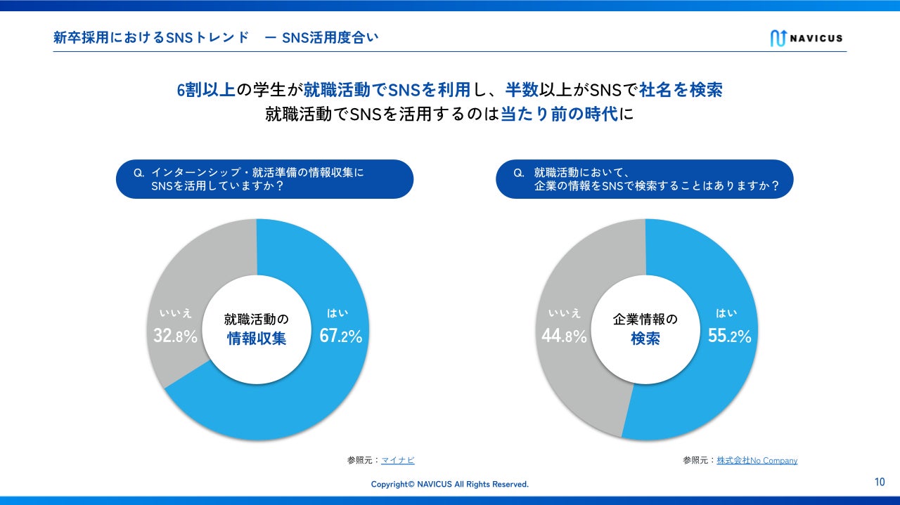 個人のコミュニケーションツールとして誕生したSNSも、昨今では政治や選挙に影響を及ぼすなど、年代問わず社会的な情報発信・収集ツールとして発展しています。SNSネイティブと称されるZ世代の就職活動においてもその影響力は如実に表れており、今や6割以上の学生が就職活動でSNSを利用し(*1)、半数以上が選考に関わる社名をSNSで検索しているという調査結果も出ています。また、SNS上で目にする情報は学生の入社意向の向上や意思決定にも作用しています(*2)。