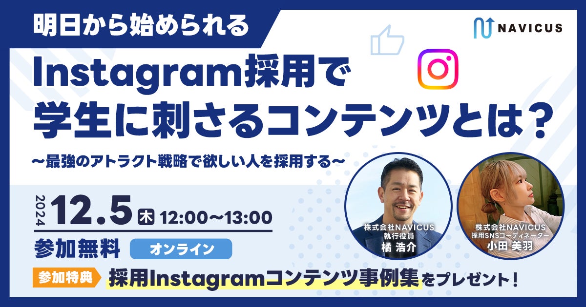 2024年12月5日(木)に、無料ウェビナー『明日から始められる Instagram採用で学生に刺さるコンテンツとは?~最強のアトラクト戦略で欲しい人材を採用する~』を実施いたします。11月に実施した同内容のウェビナーは満足度96%となっており、Instagramの機能や学生のニーズにマッチしたコンテンツ設計についてお伝えする内容となっております。