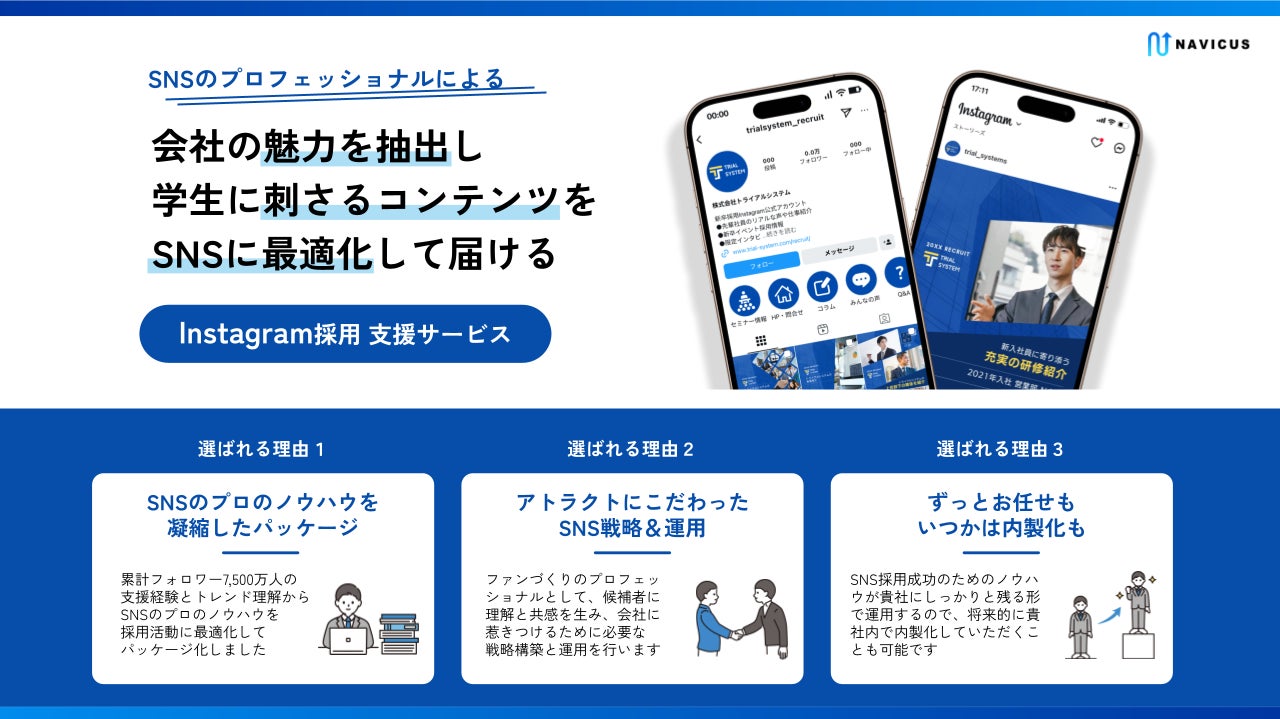 NAVICUSが、会社の採用活動に特化した「Instagram採用支援サービス」の提供を開始!会社の魅力診断からSNS運用・分析まで一貫してサポートします。