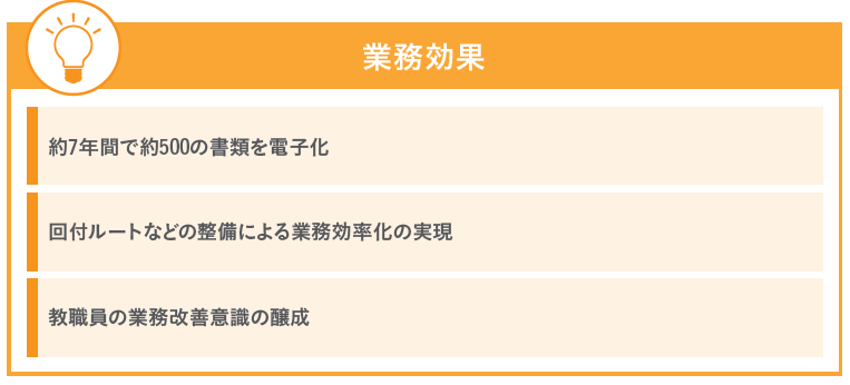 主な運用担当を務められたのは情シス部門ではない総務や経理を担当される2名でしたが、トップダウンによる導入と、教職員を巻き込んだ業務改善が功を奏し、ごく少数の運用体制でもペーパーレス化を推進し、今日に至るまで学内での多種多様な業務効率化を実現されています。