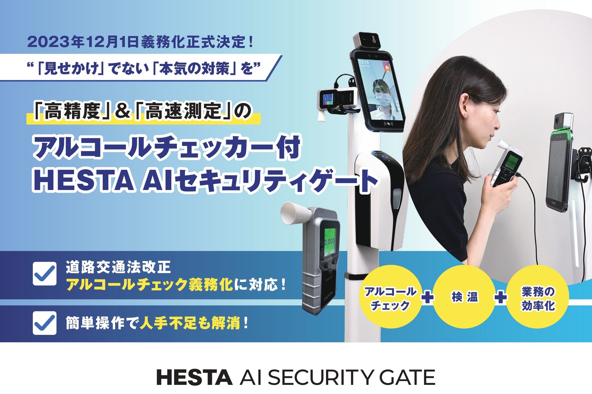 アルコールチェック義務化に対応!「見せかけ」の対策の悲劇を繰り返さない。アルコール検知機能付き「HESTA AI セキュリティゲート」が企業を悩ます飲酒運転対策をサポート。