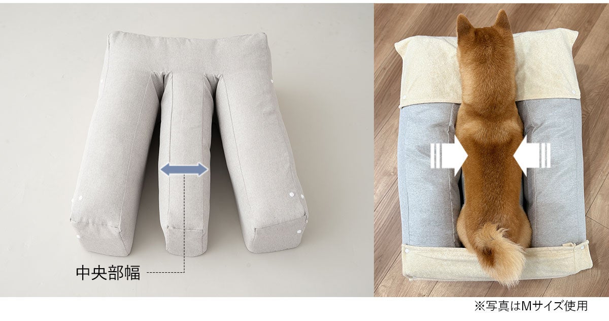 Sサイズ:超小型犬、小型短足犬 Mサイズ:中型犬、中大型短足兼 Lサイズ:大型犬 ※上記はあくまでも目安です。サイズをお確かめの上お買い求めください。 ※ワンちゃんの前足は骨格上、人間のように真横に広げることはできません。四肢の内側が中央部の幅以内か必ずお確かめください。 ※愛犬がリラックスできる体勢になるよう、高さはベッド内のウレタンをカットしたり、頭や四肢の下にタオルを挟むなど、適切に調整ください。 |