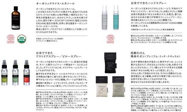 「お米でできたアウトドアスプレー」は、岩手県の耕作放棄地や休耕地を活用して栽培する有機JAS玄米から作られたオーガニックライス・エタノールをベースに、新潟の杉蒸留水、ネパール産のフェアトレード精油をバランスよく配合した、化粧品グレードのアウトドア向けボディ用ミストです。昆虫忌避剤といわれる化学合成成分のディートは使用せず、シトロネラ・シダーウッド・ユーカリ・和ハッカなど、天然精油の香りのみを用いて、自然豊かな屋外活動における、幅広い年代の方のお肌をサポートします。