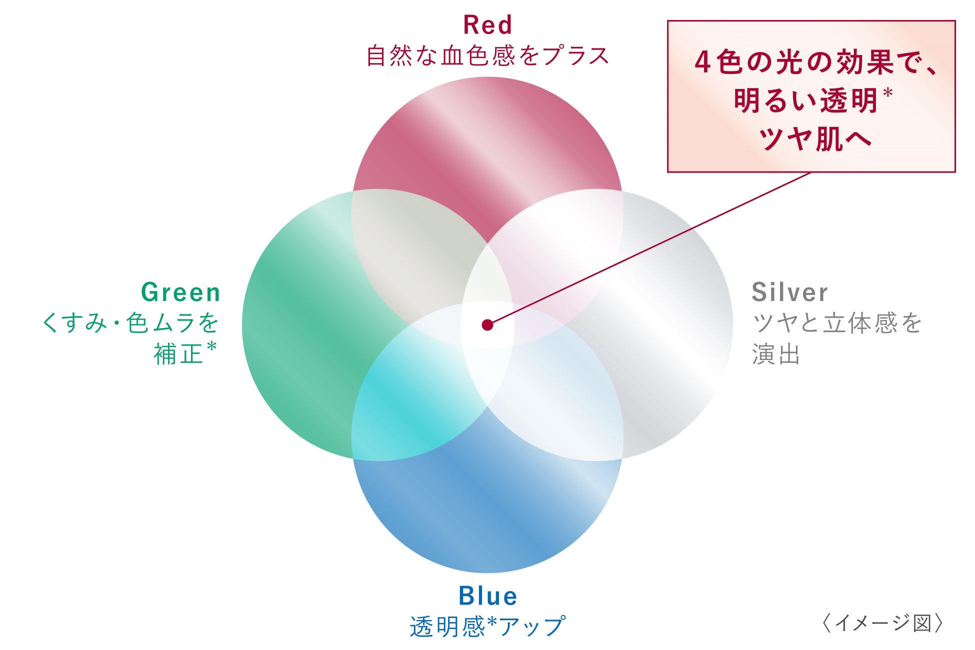 4色のパールパウダーを配合。光の三原色(レッド・ブルー・グリーン)の重なりによって色の明度が上がる「加法混色」の効果を応用し、肌のくすみ・色ムラをカバーします。さらに、シルバーパールの光効果で、透明感*のある立体的なツヤ肌に仕上げます。