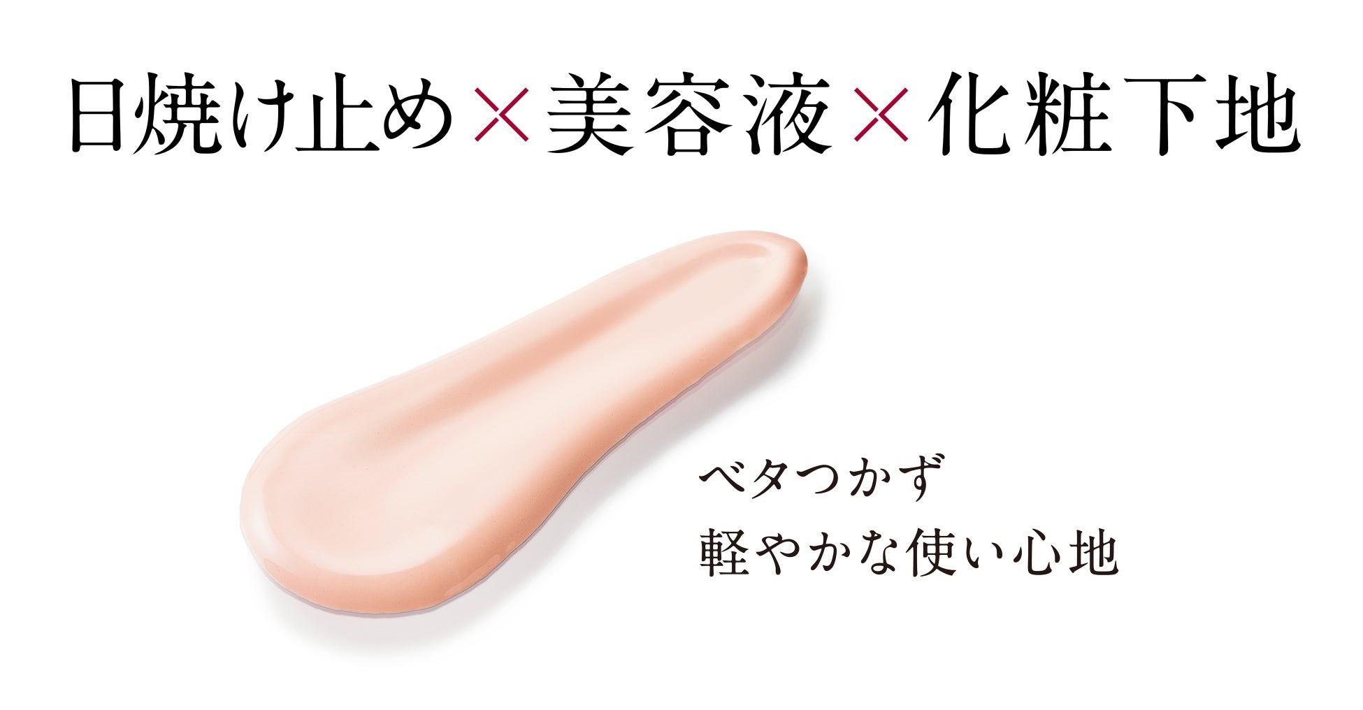 日焼け止め・美容液・化粧下地の機能がこの1本に。なめらかなテクスチャーが、紫外線ダメージ*で乾燥した肌にも溶け込むように広がり、ベタつかず、潤いのあるツヤ肌に。