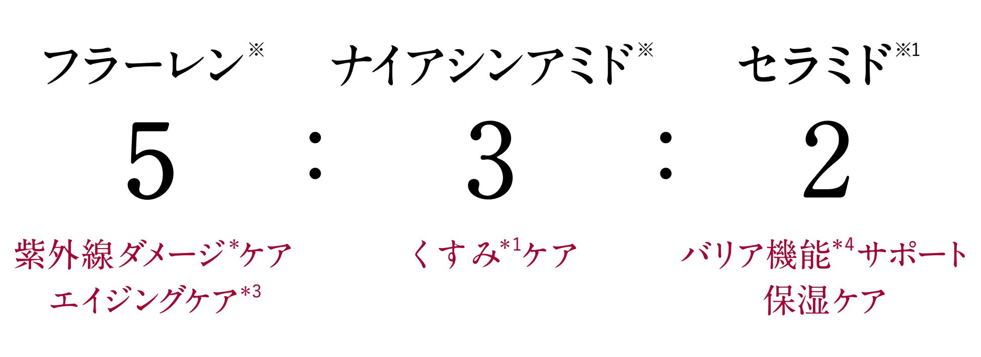 原液を知り尽くすチューンメーカーズが厳選した3種の原液*2を独自の”美肌比率”で調合。日焼けによるシミ・ソバカスを防ぐだけでなく、すでに受けてしまった紫外線ダメージ*とくすみ*1をケアして潤いのある透明肌に整えます。