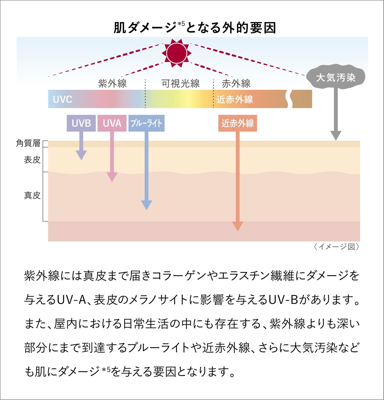 紫外線(UVA/UVB)だけでなく、ブルーライト、近赤外線、大気汚染からも肌を守ります。