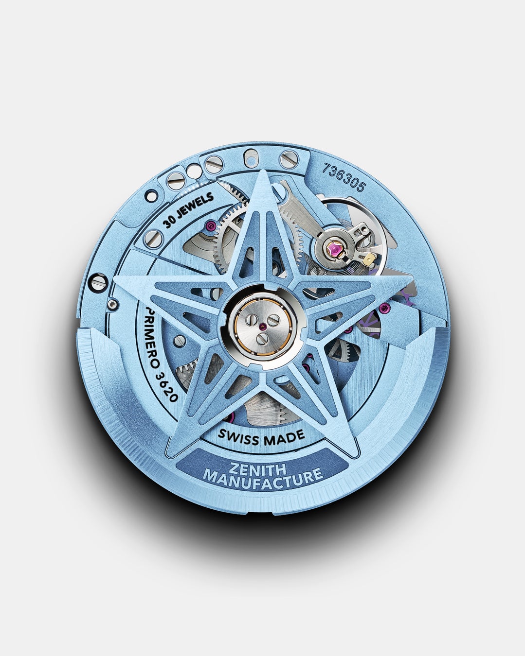 オープンワークの文字盤とサファイアガラスのシースルー仕様の裏蓋からは、高振動自動巻スケルトンキャリバー エル・プリメロ 3620 SKを眺めることができます。また、初の仕様として、キャリバーを星形のブリッジとマッチする色合いに仕上げ、一体感のあるライトブルーを文字盤に表現しました。