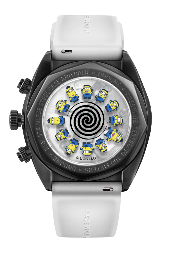 UNDONEとミニオンとのコラボレーション第2弾は、時計ファンとミニオンファンに捧げるモデルとして登場。時計本来のクールで洗練されたデザインに、人気のピクセルアートのミニオンをあえて描くことで、愉快なギャップを楽しめる時計となりました。