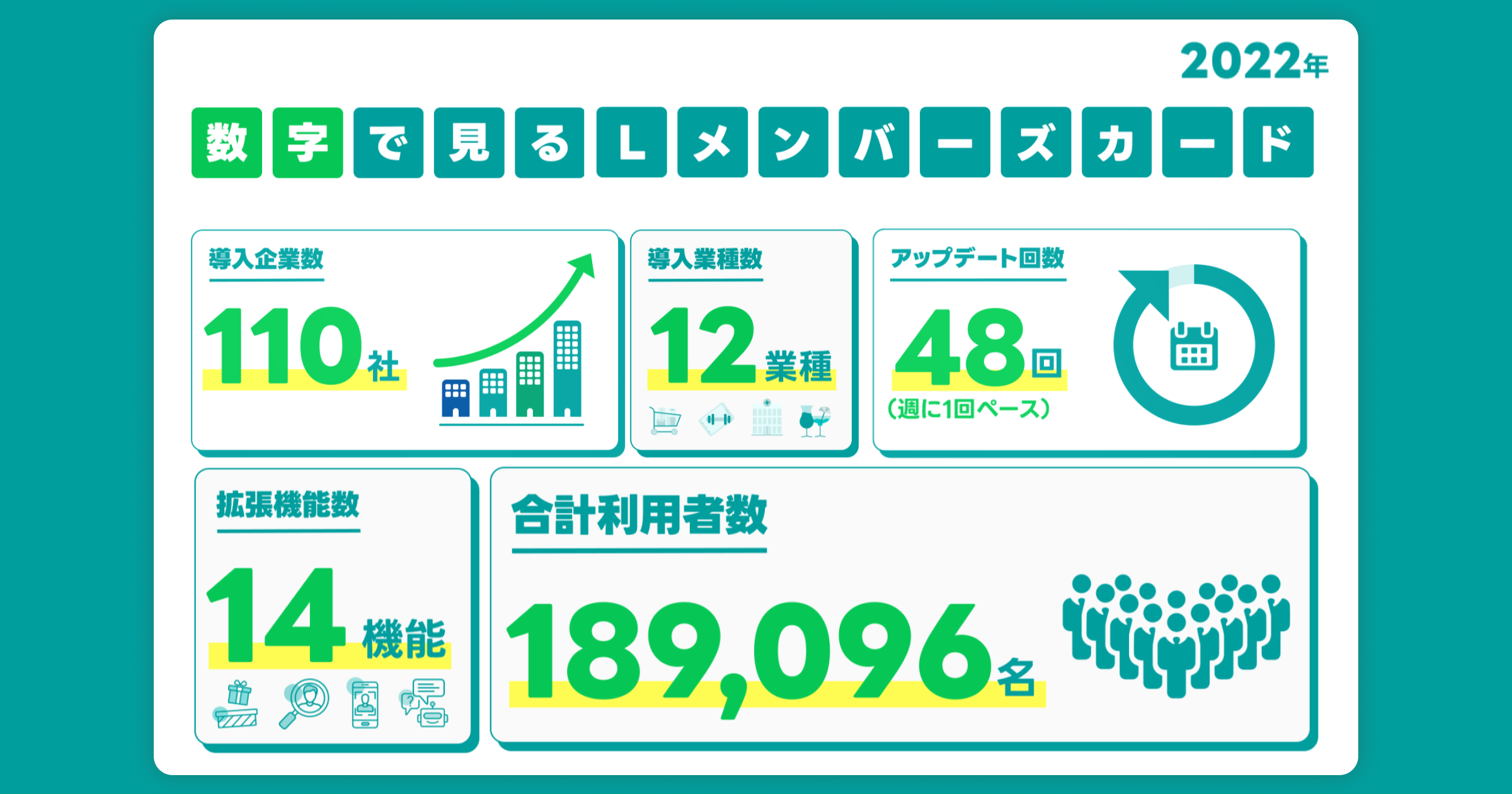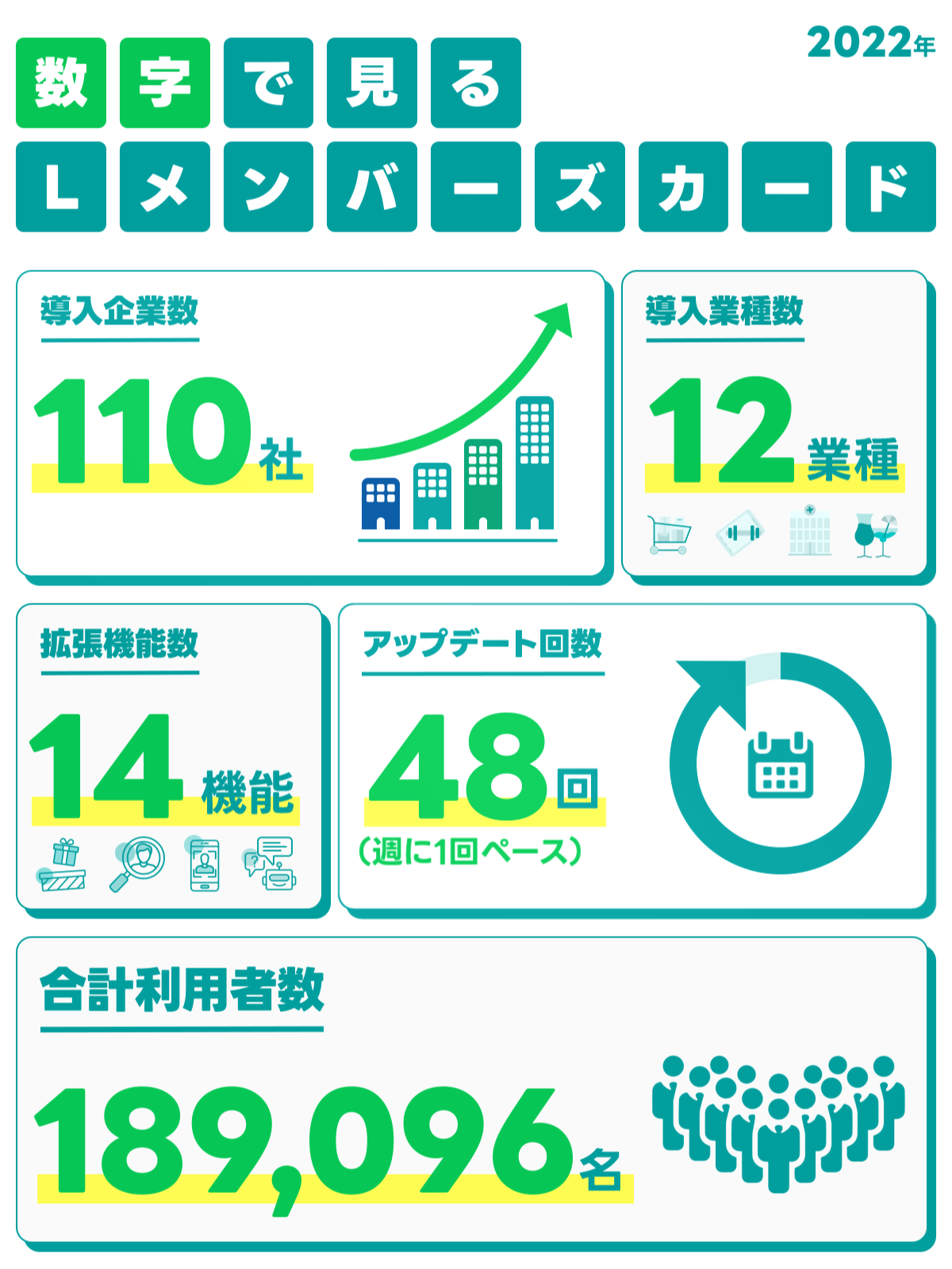 Lメンバーズカードは、お客様からのご意見やご要望をもとに、日々様々なアップデートを行っております。その結果、2022年末時点での拡張機能数は「14機能」、アップデート回数は「48回」となりました。