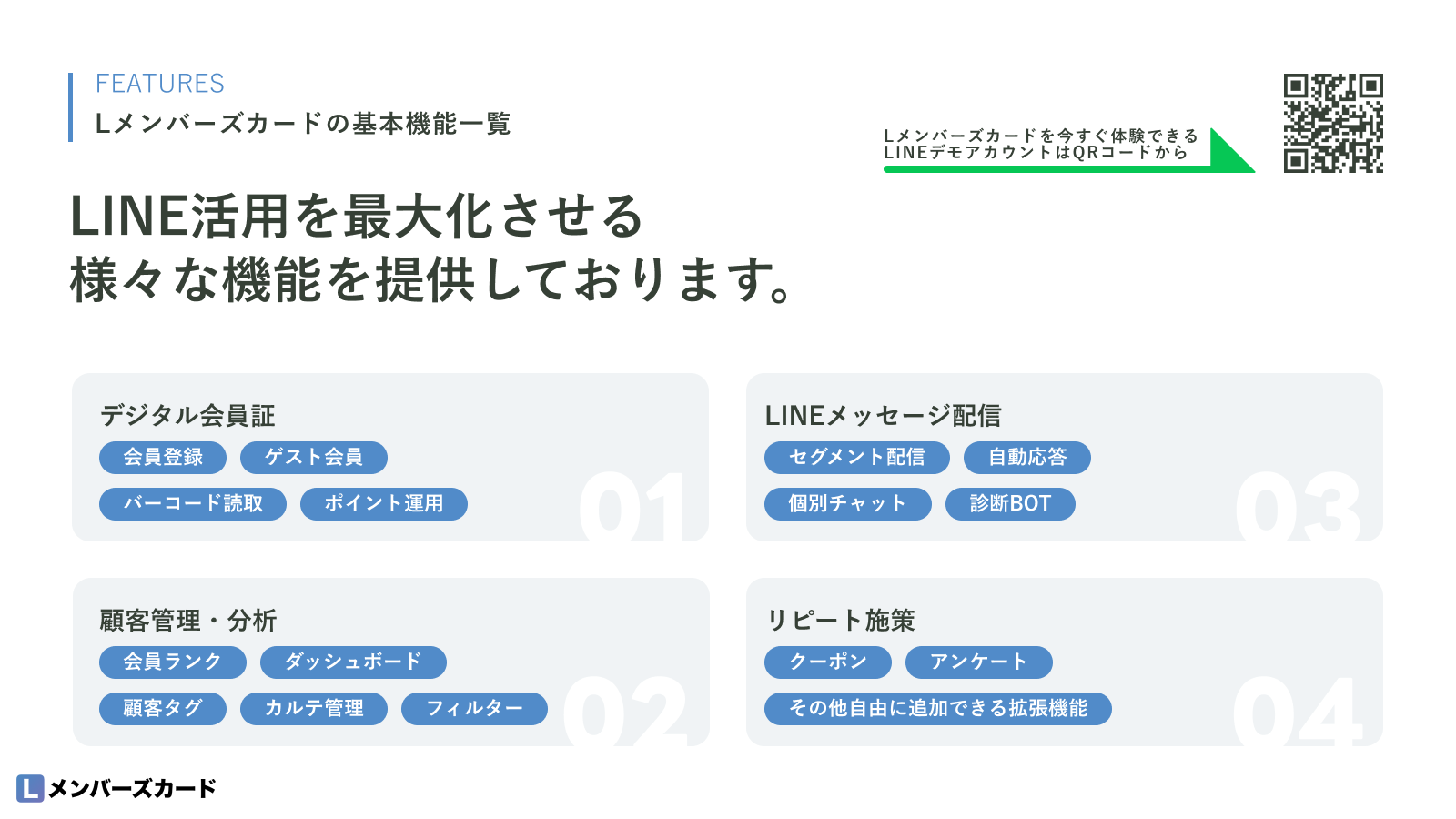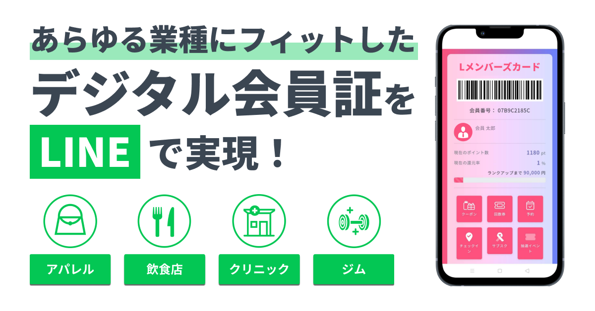 「Lメンバーズカード」は、LINEミニアプリ上で完結し、多くの業種に対応する豊富な拡張機能を持ったデジタル会員証サービスです。Lメンバーズカードを店舗や企業に導入することで、スマホアプリのインストールや面倒なログイン作業が不要で、LINEさえあればすぐに会員証・ポイントカードの提示が可能になります。