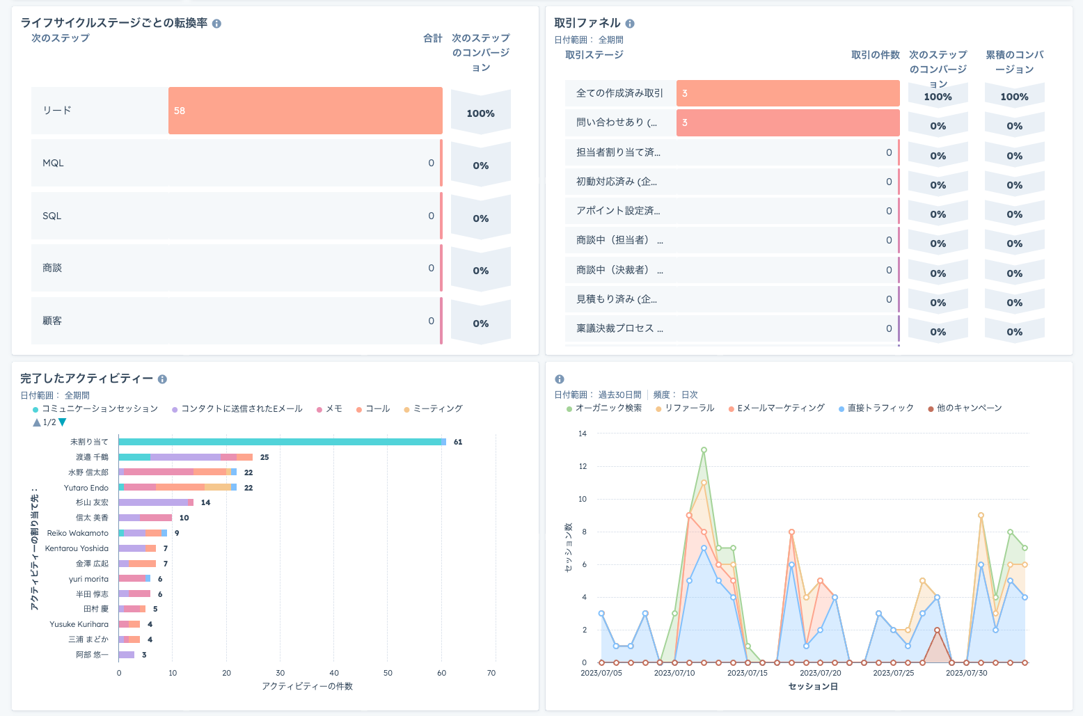 HubSpotでご利用中の製品(Hub)にあわせて、営業、マーケティング、カスタマーサポートに関するレポートをお客様のダッシュボードに無料で作成します。各種レポート設定後に、100のHubSpotコンサルタントが調査結果と推奨事項などの解析結果をフィードバックいたします。