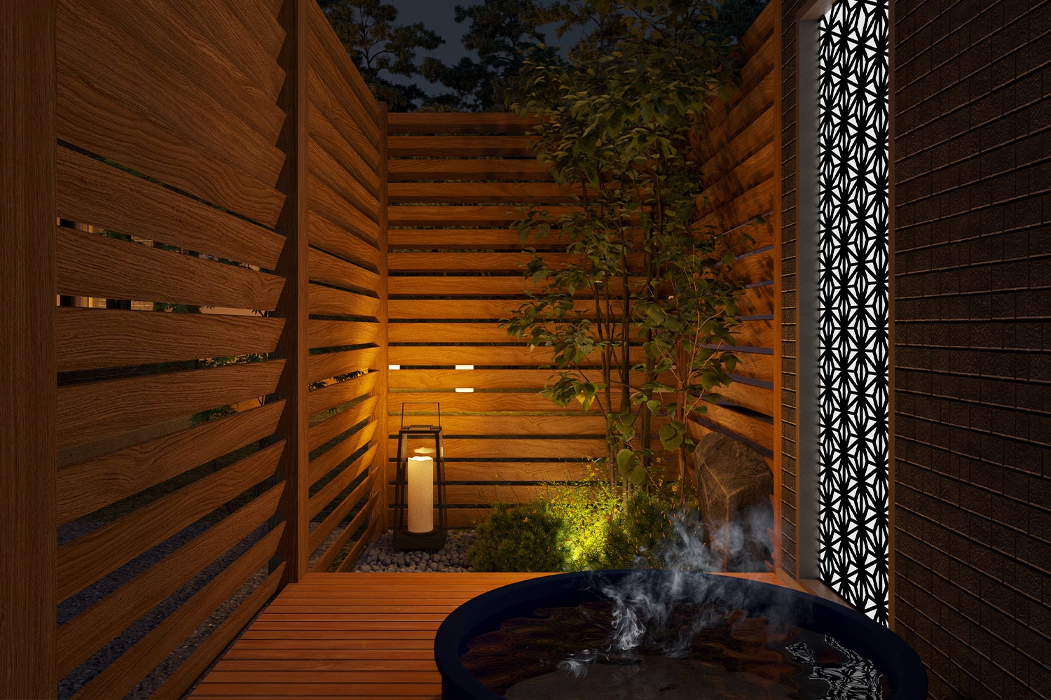 客室スペースには天然温泉露天風呂、全天候型BBQスペースが全棟備わっており、快適にお過ごしいただけます。また、夜には備え付けの焚き火台でキャンプファイヤーをお楽しみいただけます。