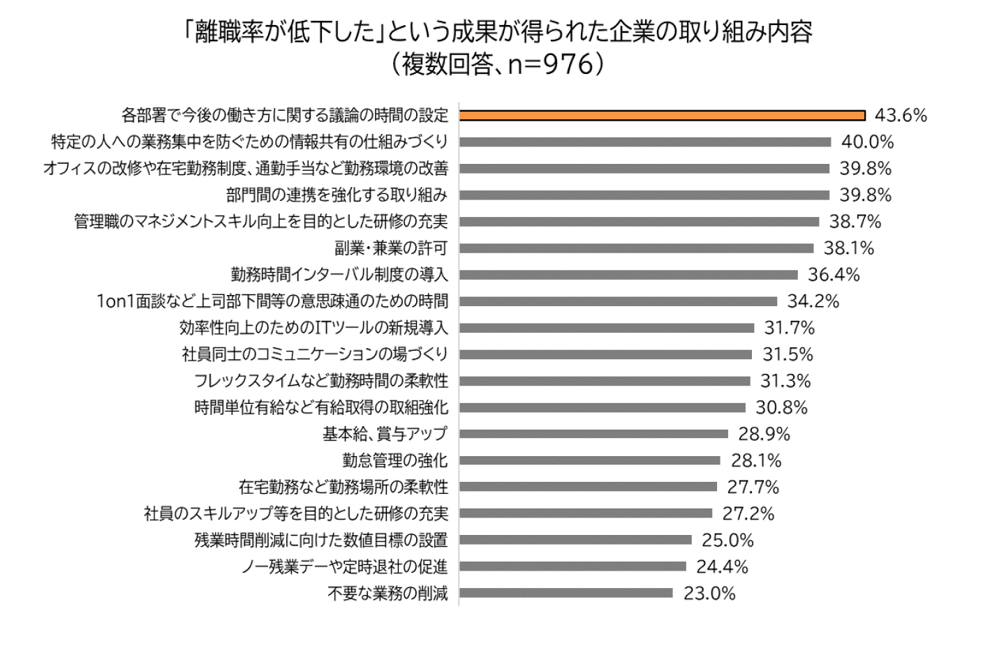 3. 離職率が低下した企業が実践していた取り組みで最も多かったのは「各部署で今後の働き方に関する議論の時間の設定」(43.6%)だった。「情報共有の仕組みづくり」(40.0%)が次点となっており、働き方改革の議論が職場で行われていることや属人化の防止が離職につながることが示唆された。