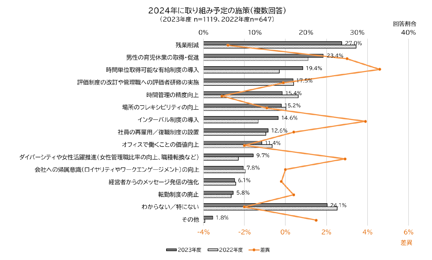 7. 2024年に取り組む予定の施策または取り組みたいと思う施策は、1位が「残業削減」(27.0%、昨年比-2.8%)だった。昨年度からの増加率が大きかったのは「時間単位取得可能な有給制度の導入」(19.4%、昨年比+4.6%)や「インターバル制度の導入」(14.6%、昨年比+3.9%)、「男性の育児休業の取得・促進」(23.4%、昨年比+3.0%)であり、さらに仕事と家庭の両立を図りたいという労働者側の望みがうかがえる結果となった。