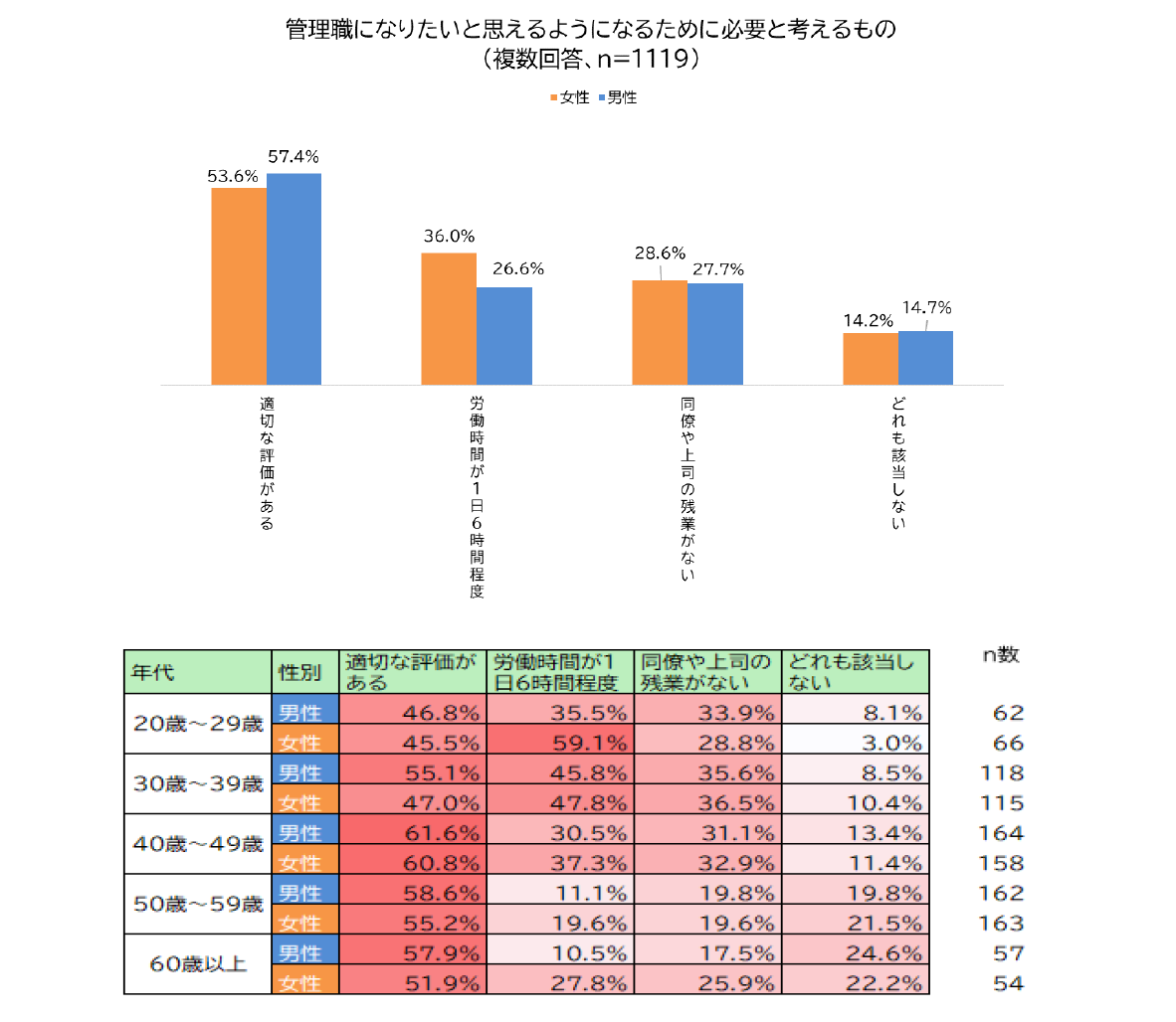管理職になりたいと思えるようになるために必要と考えるものの1位は、すべての性別・年代を総合してみると「適切な評価がある」(女性:53.6%、男性:57.4%)でしたが、年代別にみると30代以下の女性においては、「労働時間が1日6時間程度」が1位になっています。