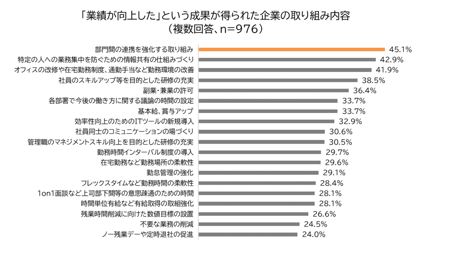 業績が向上した企業で実践していた取り組みで最も多かったのは「部門間連携を強化する取り組み」(45.1%)でした。職場における課題の中でも根本的な課題は部署外に存在していることが多々あり、部署の枠を超えてその課題解決に取り組むことで、業績に向上つながることが示唆されます。