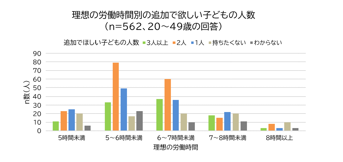 労働時間を短くすればするほどよい、というわけではなく、理想の労働時間が「5時間未満」であった場合、追加で欲しい子どもの数は比較的少なく、子どもをさらに欲しいと思えるためには、適度な労働時間(により必要な収入を自力で得られる自信を持てること)が求められていることが推測できます。