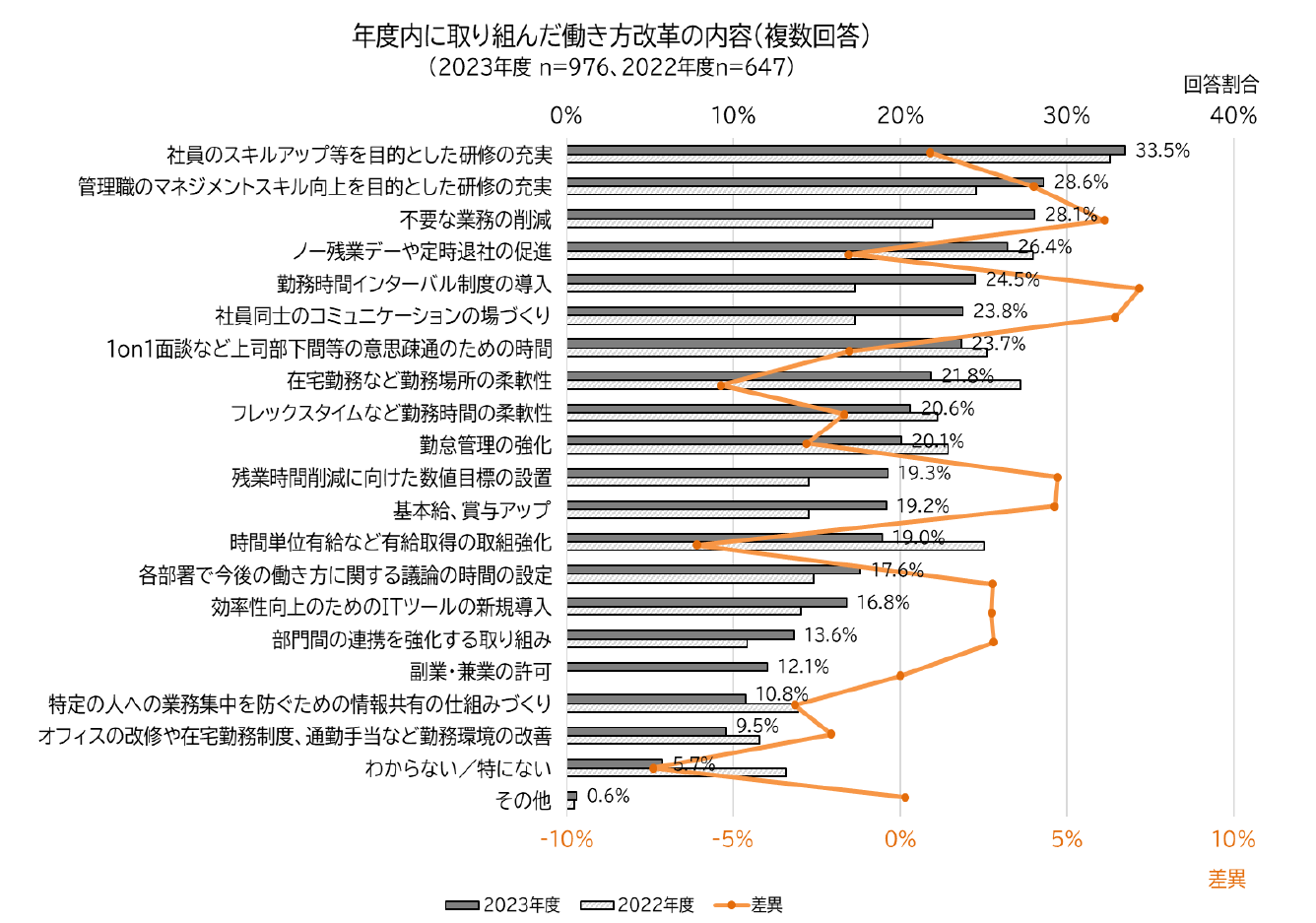 2023年度内に取り組んだ働き方改革の内容の中で、最も多い取り組みは「社員のスキルアップ等を目的とした研修の充実」(33.5%、昨年比+0.9%)でした。次いで「管理職のマネジメントスキル向上を目的とした研修の充実」(28.6%、昨年比+4.0%)が多く、昨年と同様に社員のスキルアップに取り組んだ企業が多い結果であり、特に管理職のスキルに課題意識を持つ企業が多くなっていることがうかがえます。