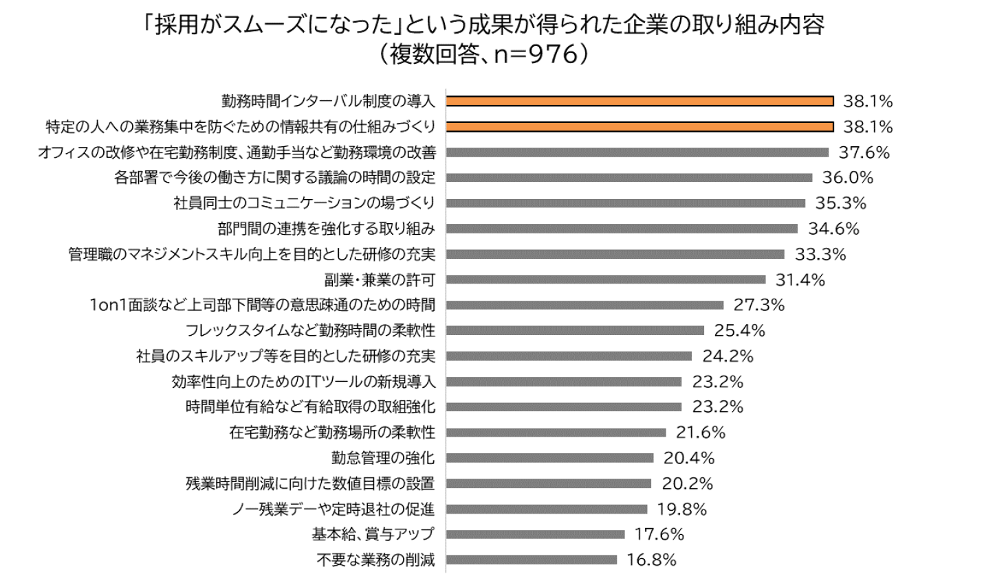 採用がスムーズになった企業が実践していた取り組みを集計したところ、最も多かった取り組みは「勤務間インターバル制度の導入」と「特定の人への業務集中を防ぐための情報共有の仕組みづくり」(それぞれ同じく38.1%)でした。