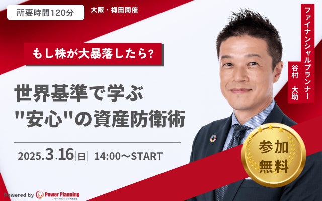 3月16日(日)14時より人気講師、谷村 大助氏による「もし株が大暴落したら?世界基準で学ぶ"安心"の資産防衛術」セミナーを開催いたします。