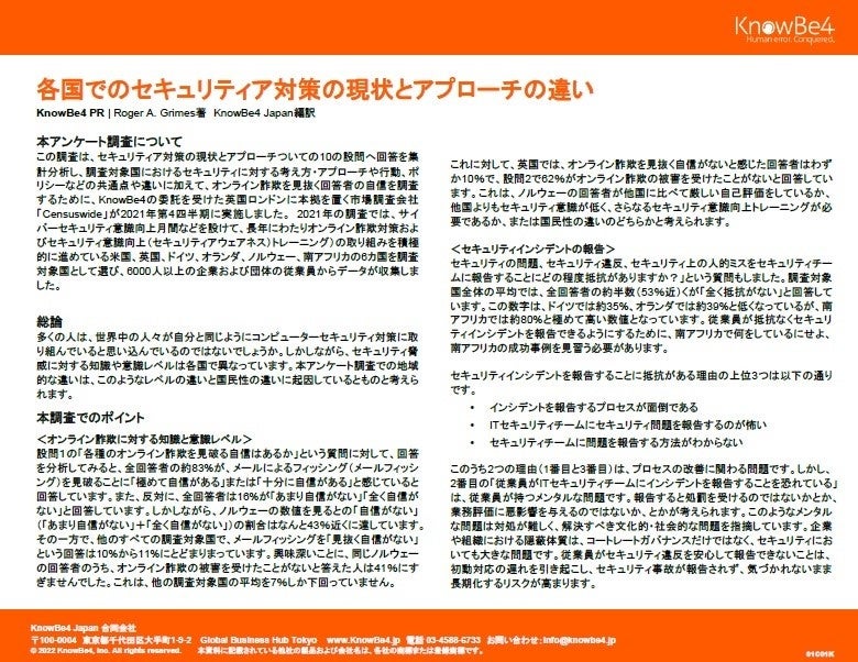 東京(2022年2 月17日発) – セキュリティ意識向上トレーニングとフィッシングシミュレーション・分析を組み合わせた世界最大の統合型プラットフォームのプロバイダーであるKnowBe4(本社:米国フロリダ州タンパベイ、創立者兼CEO:Stu Sjouwerman (ストゥ・シャワーマン))は、世界でのセキュリティに対する考え方・アプローチや行動、ポリシーなどの共通点や違いに加えて、オンライン詐欺を見抜く回答者の自信を調査するために、英国ロンドンに本拠を置く市場調査会社「Censuswide」に委託して、アンケート調査を2021年第4四半期に実施しました。今回の調査では、オンライン詐欺対策やセキュリティ意識向上トレーニングの取り組みで先行している米国、英国、ドイツ、オランダ、ノルウェー、南アフリカの6カ国を調査対象国として選び、6000人以上の企業および団体の業務に従事している従業員からデータが収集しました。本プレスリリースは、このアンケート調査を日本語に翻訳し、欧米諸国の現状を探求するために作成しました。