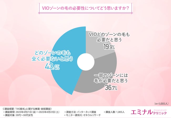 「VIOゾーンの毛の必要性についてどう思いますか?」と質問したところ、『どのゾーンの毛も全く必要ないと思う(43.4%)』と回答した方が最も多く、次いで『一部のゾーンには毛が必要だと思う(36.7%)』『VIOどのゾーンの毛も必要だと思う(19.9%)』と続きました。