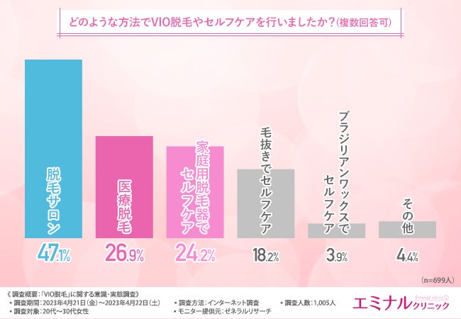 「どのような方法でVIO脱毛やセルフケアを行いましたか?(複数回答可)」と質問したところ、『脱毛サロン(47.1%)』と回答した方が最も多く、次いで『医療脱毛(26.9%)』『家庭用脱毛器でセルフケア(24.2%)』『毛抜きでセルフケア(18.2%)』『ブラジリアンワックスでセルフケア(3.9%)』と続きました。