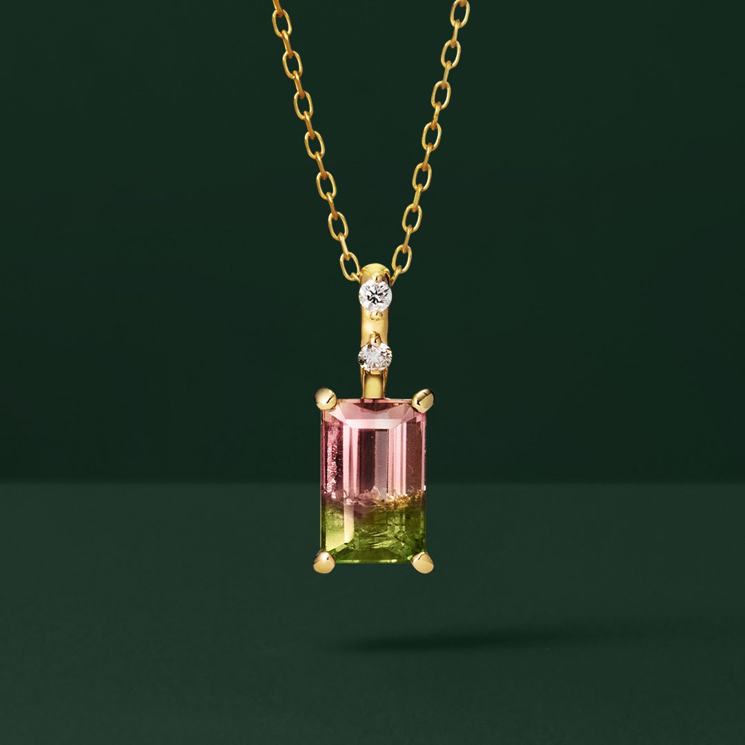 花の色と若草の色・・美しい情景を映し出すバイカラートルマリンを、朝露のようなダイヤモンド煌めくペンダントトップにアレンジ。自然が描いた唯一無二の配色から、心惹かれる1点をお選びください。