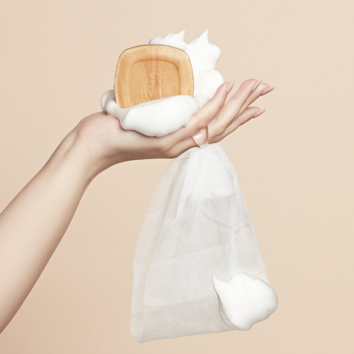 まるでキャンディーのようなオリジナルリングが付いた、HACCIこだわりの泡立てネット。ロングセラー「はちみつ洗顔石けん」のぼってり濃密な泡を素早くつくり出します。