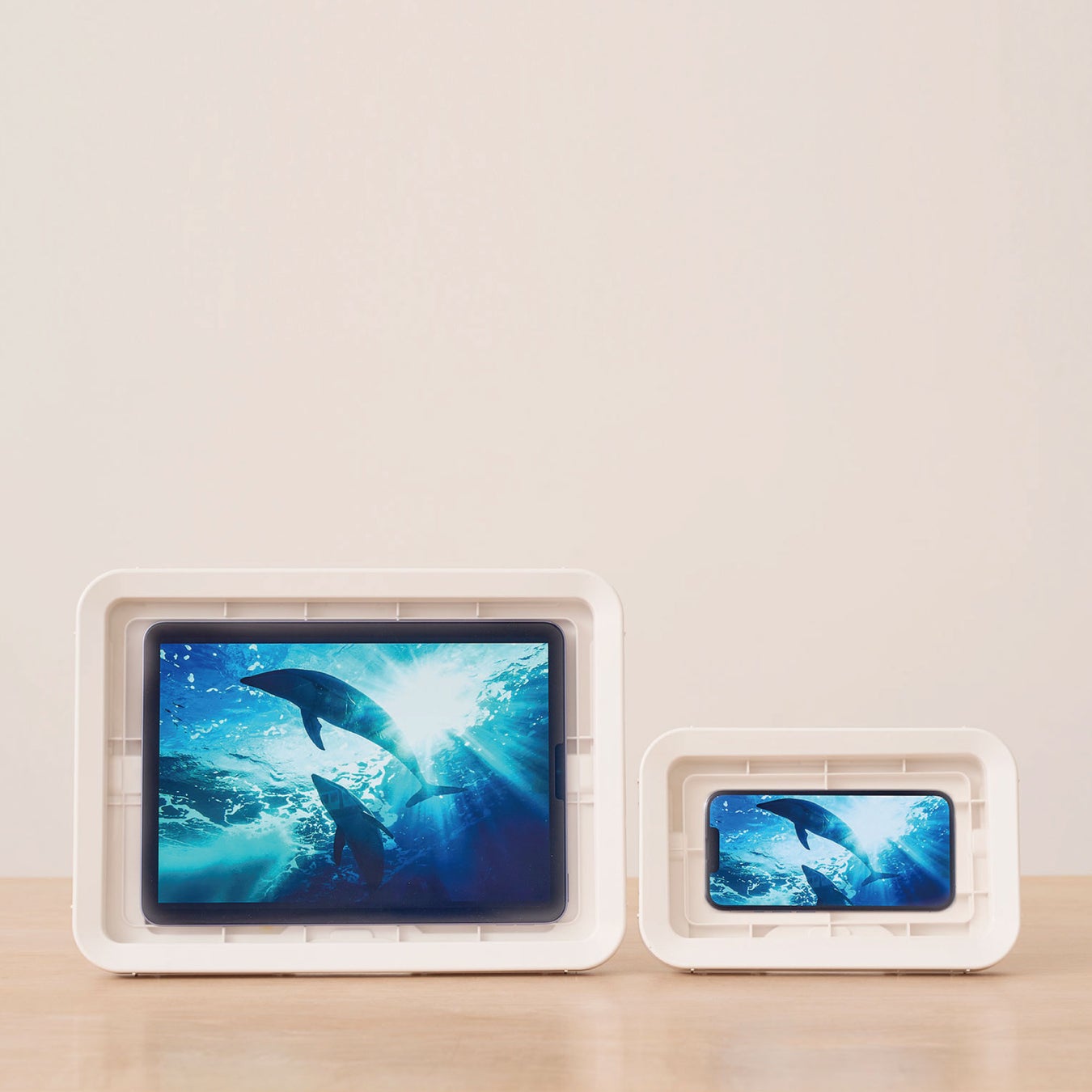 MAGSPEAKER DUO の2つのスピーカーの間にMAGCASEを貼り付ければ、映像も楽しむことができ、普段のおふろ時間が特別な時間に変わります。
