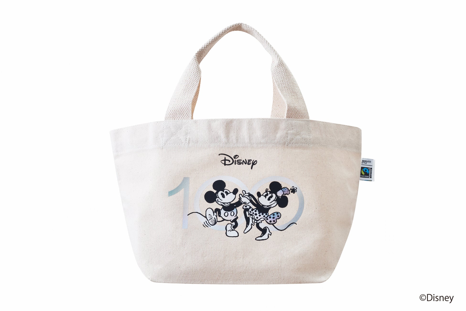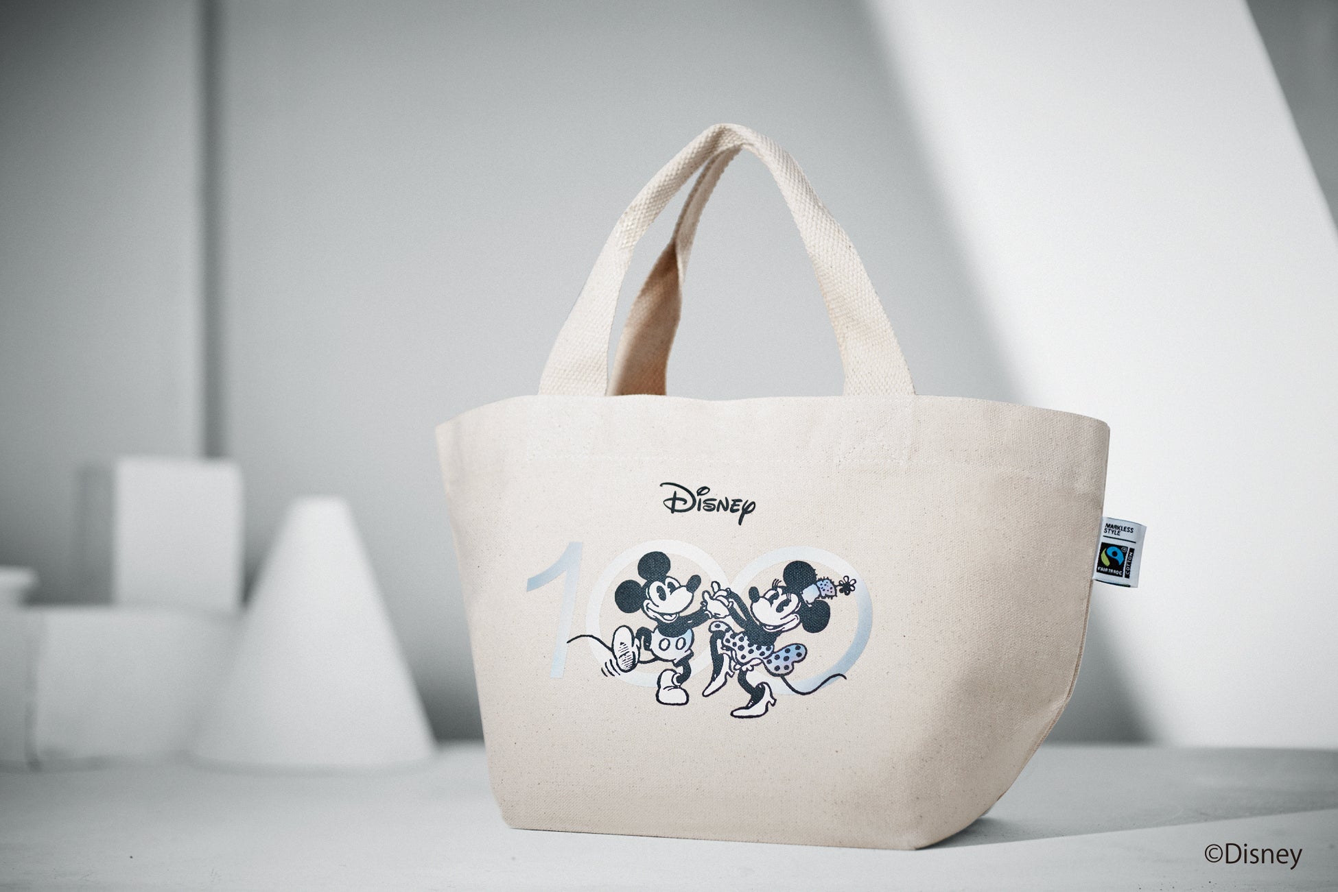 ディズニー創立100周年を祝し、レトロなミッキーマウスとミニーマウスが手を取り合う可愛らしい限定デザインを施しました。生地には、フェアトレードオーガニックコットンを使用し、便利で地球にもやさしく、心地よく使っていただけるようにこだわっています。サイズは、約縦210mm×横390mm、マチ幅約130mm。お弁当箱と水筒などを重ねずにゆったり入れたり、オフィスでの必需品もまとめて入ります。マイバッグとしてちょっとしたお買い物にも使いやすいサイズ感です。