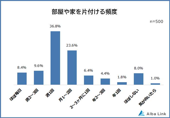 片付けが苦手な人500人に「部屋や家を片付ける頻度」を聞いたところ、最も多かったのは「週1回(36.8%)」でした。
