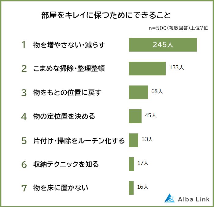 最後に、片付けが苦手な500人に「部屋をキレイに保つためにできること」を聞きました。