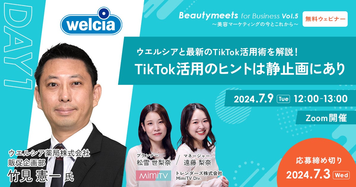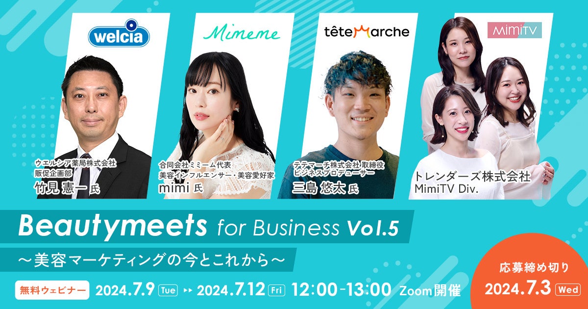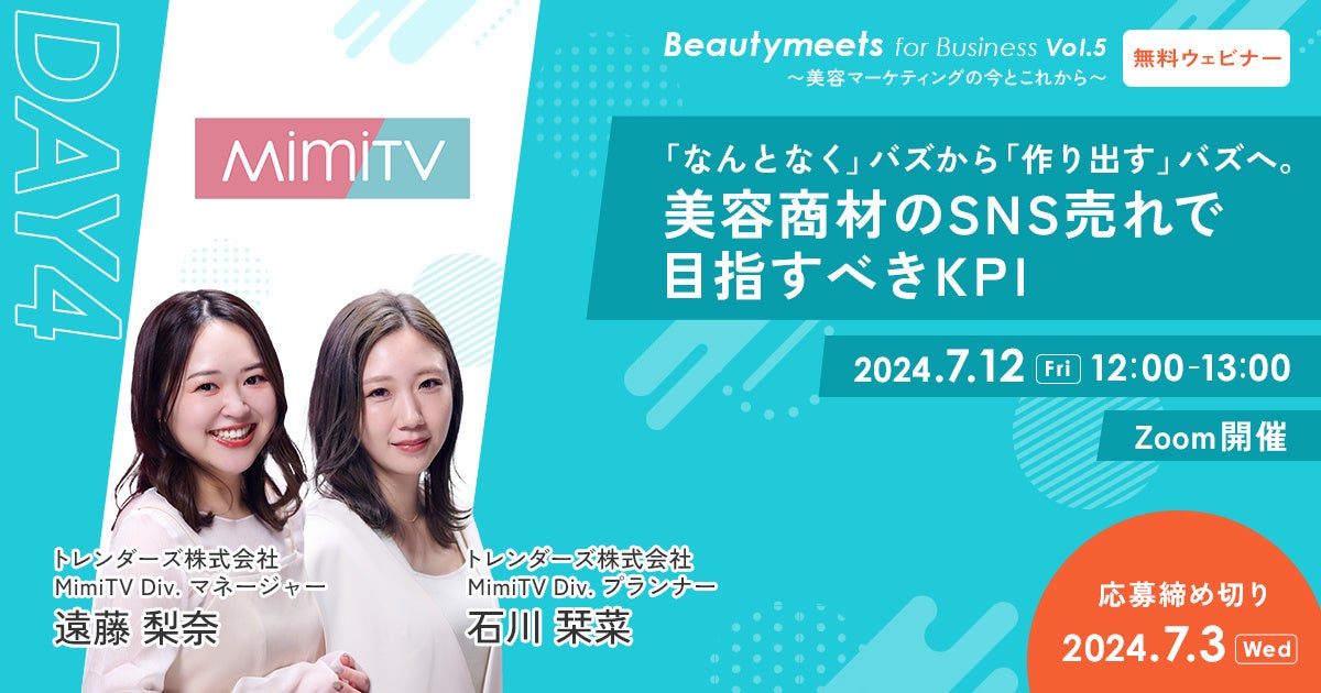 2024年2月に開催した「Beautymeets for Business Vol. 4」では開催史上最高視聴数を記録し、1日の視聴数が350名を超えた日もあり、大盛況でした。前回の反響を受けて今回も豪華なゲストをお招きし、MimiTVが掲げるコンセプト「美容でときめく世界を、一緒に」をテーマに、最新の美容×SNSマーケティングトレンドを解説します。各回にウエルシア薬局株式会社、美容インフルエンサーmimi氏、テテマーチ株式会社の方々をゲストにお迎えし、流通視点から見た最新のTikTok活用、美容×SNSバズの遍歴、SNSネイティブの実態やターゲット戦略など、様々な切り口から美容×SNSマーケティングの今とこれからを語り合います。最終日には、ご相談頻度の高い「SNSプロモーションの指標」についてお答えすべく、最新バズコスメの分析をもとにした「美容商材のSNS売れで目指すべき新KPI設計」をMimiTVプランナーよりご紹介します。各回多様なテーマとゲストを迎え実施する本イベントは、美容商材のマーケティング、SNSマーケティングに携わる方には必見です。