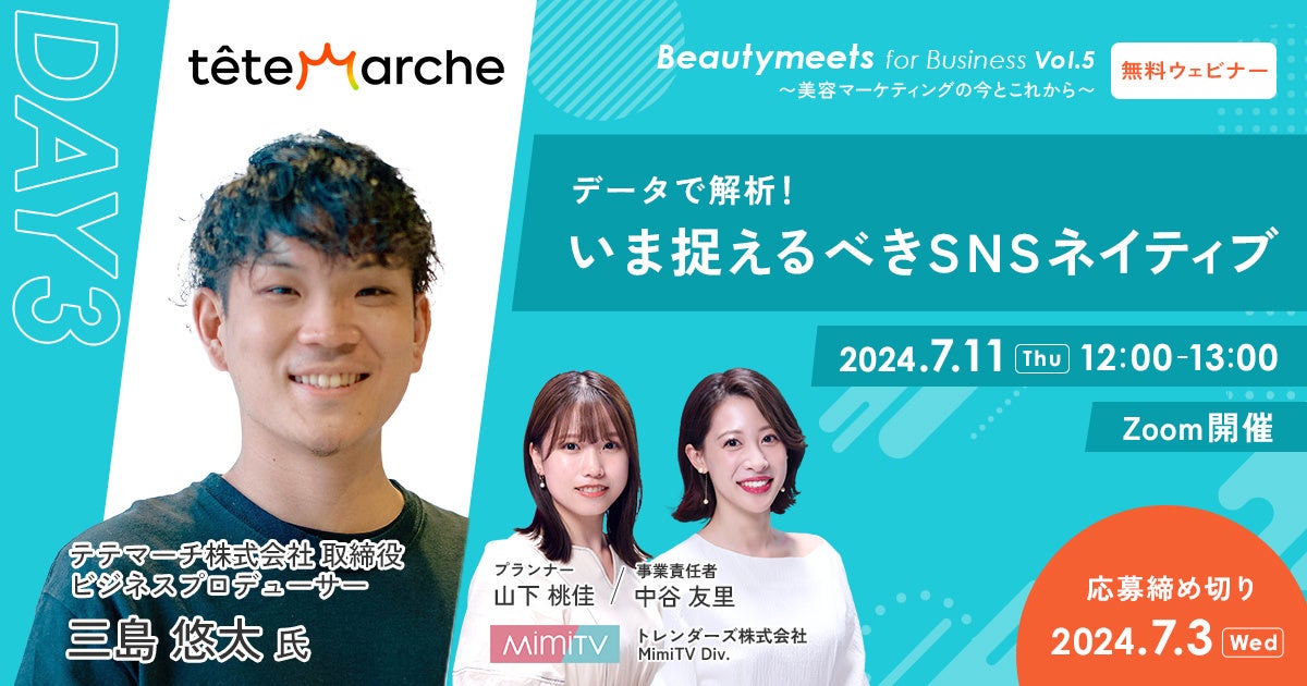 そのために、「これからの」SNSネイティブの実態を予測し、そこに向けた「いま必要なSNSネイティブ戦略」を解説します。美容×SNSマーケティングに強みを持つMimiTVプランナーが、200社以上のSNSマーケティングを支援してきたテテマーチ社取締役と一緒に、SNSネイティブの攻略を考えていきます。