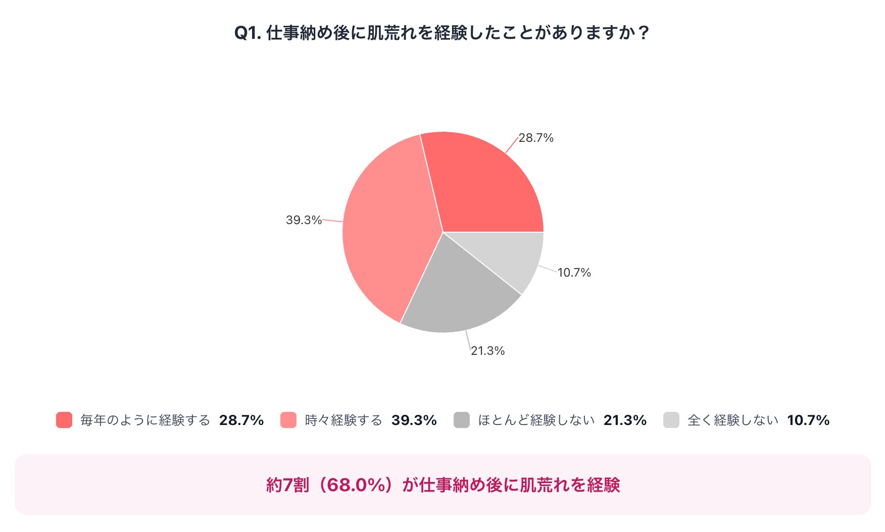 その結果、「毎年のように経験する」が28.7%、「時々経験する」が39.3%となり、合わせて68.0%の方が仕事納め後の肌荒れを経験していることが分かりました。