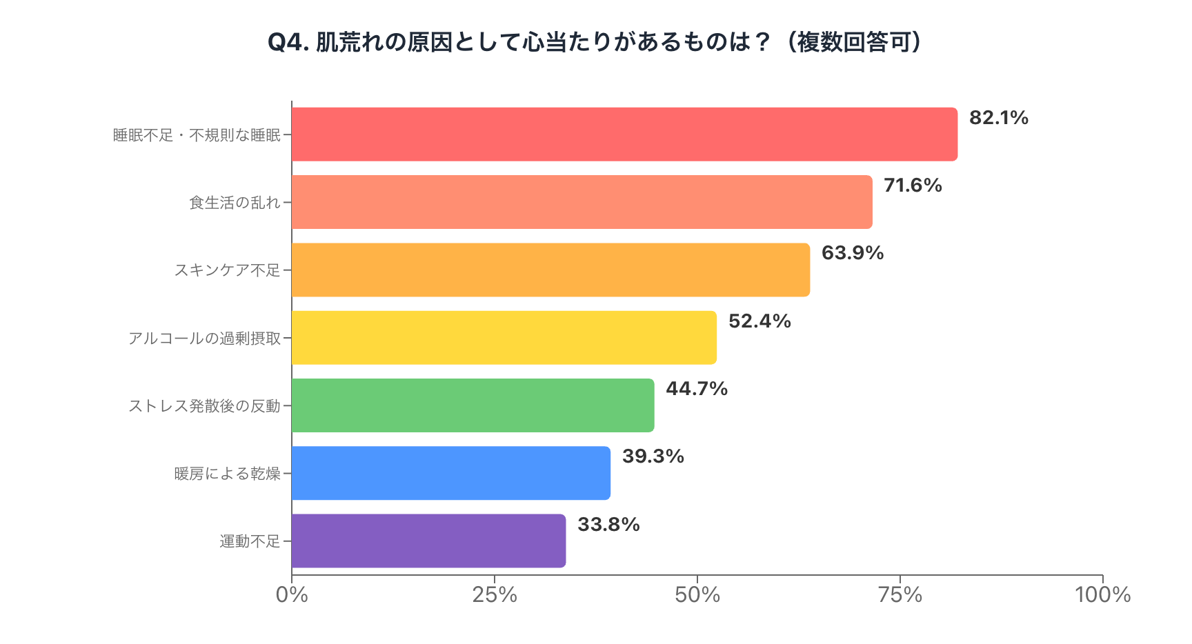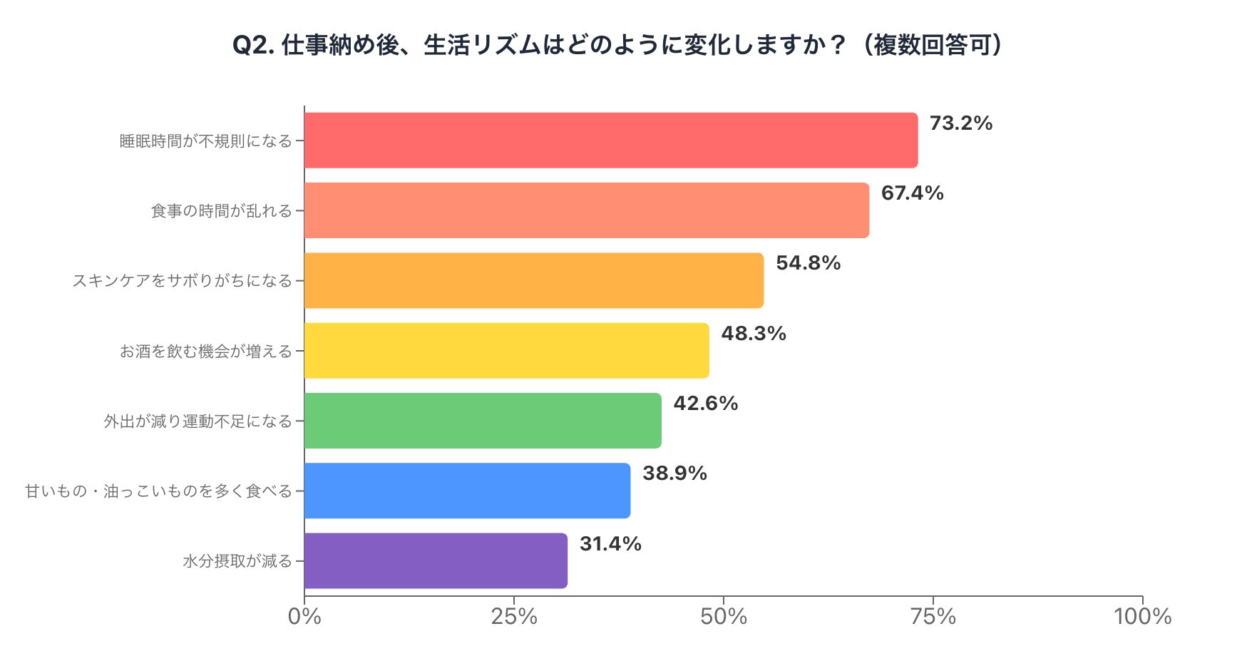 その結果、約7割の方が仕事納め後に肌荒れを経験しており、その背景には「睡眠の不規則化」「食事の乱れ」「スキンケアの放置」といった生活リズムの崩壊があることが分かりました。