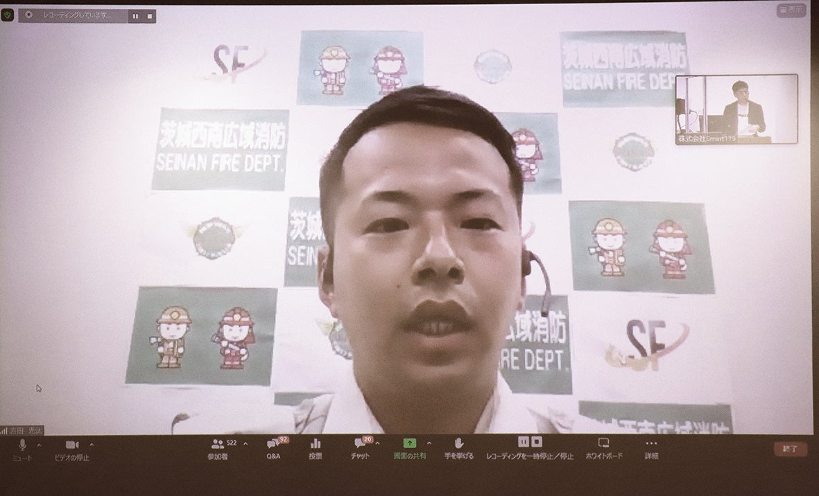 今回のオンラインシンポジウムは、特別講演として米国カリフォルニア州救急救命士・藤原 翔氏を迎えた『アメリカ(Los Angeles)の救急活動について』を実施。一般講演として救急救命士・外来看護師 松本 拓氏による「in ホスピタルからのメッセージ」、茨城西南広域消防本部・救急救命士 吉田光汰氏による「迅速な搬送が奏功した急性心筋梗塞の一例」、大阪府八尾市立病院救急科 山本康之医師による「救急医が求める電話連絡とは」という3つのテーマを取り上げました。当社からは、救急医療支援システム「Smart119」のシステム概要と発展性の実演解説をし、パネルディスカッションでは、救急隊、救急医のそれぞれの立場からの討論で締めくくられました。