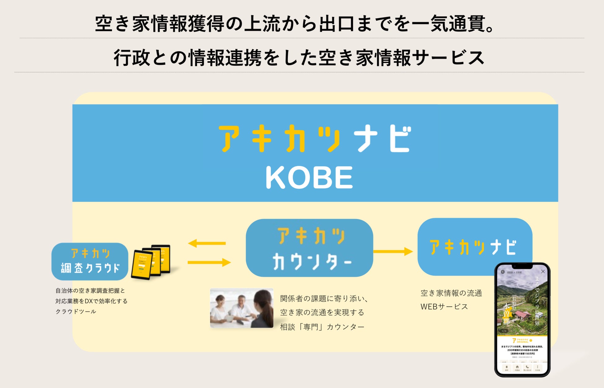 また、売る・貸すといった意思決定に至った空き家情報を全国に物件情報として発信し、神戸市内の人流はもちろん、神戸市への市外からの流入も創出するためのWEBサービス「アキカツナビ」の展開も神戸市にて開始いたします。空き家という不動産物件情報はもちろん、街の情報の同時閲覧や、空き家の流通に必要な金融サービスや保証サービスも展開します。