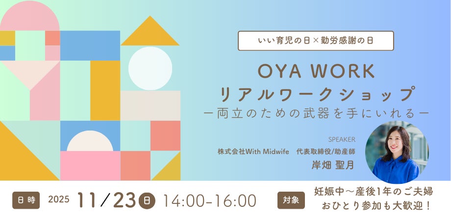 出産後の支援だけでなく、「はたらきながら親になる」までを支える仕組みが求められる中、株式会社With Midwifeは、2500組以上の両親を支えてきた実績をもとに、新たなオンライン両親学級『OYA WORK』をグランドオープンスします。記念イベントとして【勤労感謝の日×育児の日特別企画】働く親に向けたリアルワークショップー両立のための武器を手にいれるーを開催。ワークショップなどを通じて、親のリアルに向き合う知識と対話の場を届けます。