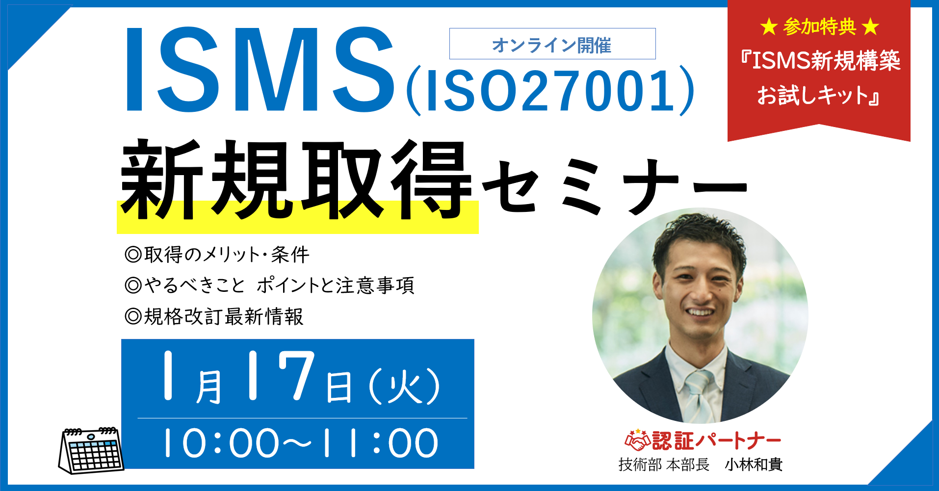 【無料ウェビナー】『ISMS(ISO27001)新規取得 初心者向けセミナー』1/17(火)10:00-11:00開催