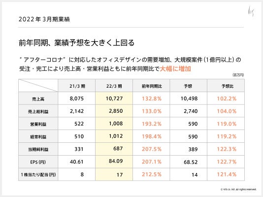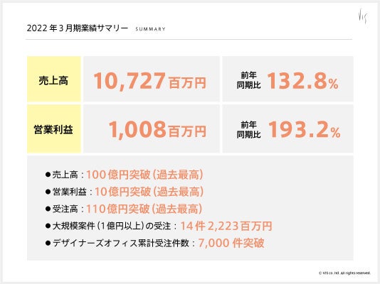 デザイナーズオフィスを手がけ、「はたらく」をデザインする株式会社ヴィス(本社:大阪市北区、代表取締役社長:中村勇人、東証スタンダード:5071)は、2022年5月13日、2022年3月期業績を発表しました。2022年3月期 通期の売上高は107億27百万円で前年同期比132.8%、営業利益は10億8百万円で前年同期比193.2%と過去最高を更新しました。